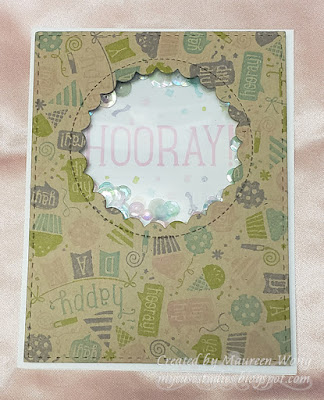 To make the shaker card, I took one of the kraft panels and die cut an opening with a Lawn Fawn die. I got a white cardstock base and stamped with the word and confetti images from the Birthday Basics set with the same ink colors. I added 2 layers of craft foam with a circle cut out of them, and filled the opening with the Enchanting sequin mix from Little Things from Lucy's Cards - it's the perfect match for my colors! Finally I sealed off the opening with some Duralar film and it was done!