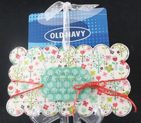 I simply stamped the large postcard onto a fun piece of patterned paper and cut it out using the matching die. I also cut another piece of plain white cardstock for the back using the same die. I glued the front and back together on the sides and bottom then added my sentiment from the Fancy Frame stamp set tied on with hand-dyed baker's twine.